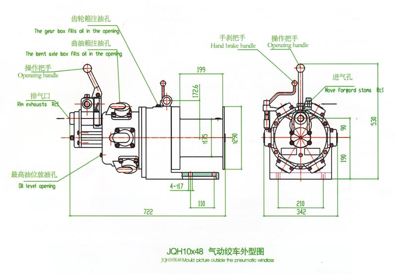 JQH1Ox48氣動(dòng)絞車.采用壓縮空氣為動(dòng)力.推動(dòng)TMH4A活塞式氣動(dòng)馬達(dá)工作。再通過二級齒輪減速.把扭矩傳給滾筒。 氣動(dòng)絞車的操縱,是靠馬達(dá)體上的手操縱轉(zhuǎn)向閥實(shí)現(xiàn)正轉(zhuǎn)、反轉(zhuǎn)、停止等項(xiàng)動(dòng)作。為保證氣動(dòng)絞車的安全性,該氣動(dòng)絞車還 具有手剎車功能。特別適合于礦山、建筑工程以及海上、陸地油田鉆并平臺上使用。