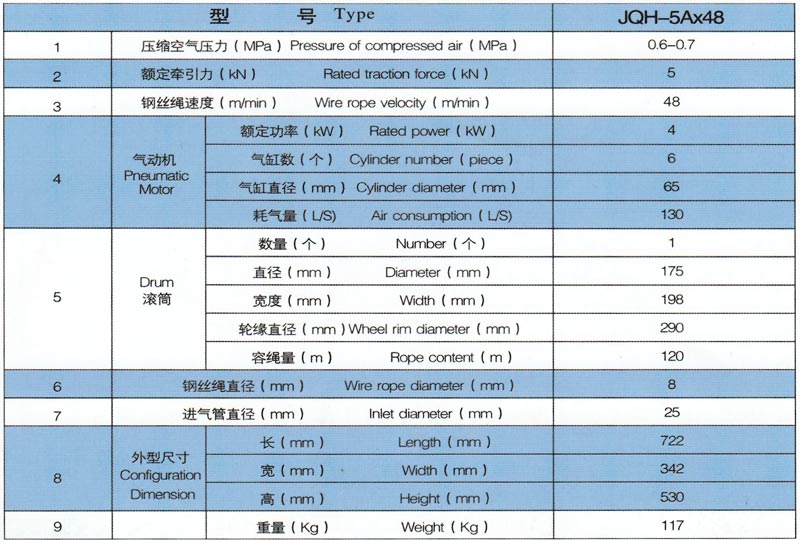產(chǎn)品簡介JQH-5Ax48氣動絞車,采用壓縮空氣為動力,推動TMH4A活塞式氣動馬達工作。再通過二級齒輪減速,把扭矩傳給滾筒。氣動絞 車的操縱.